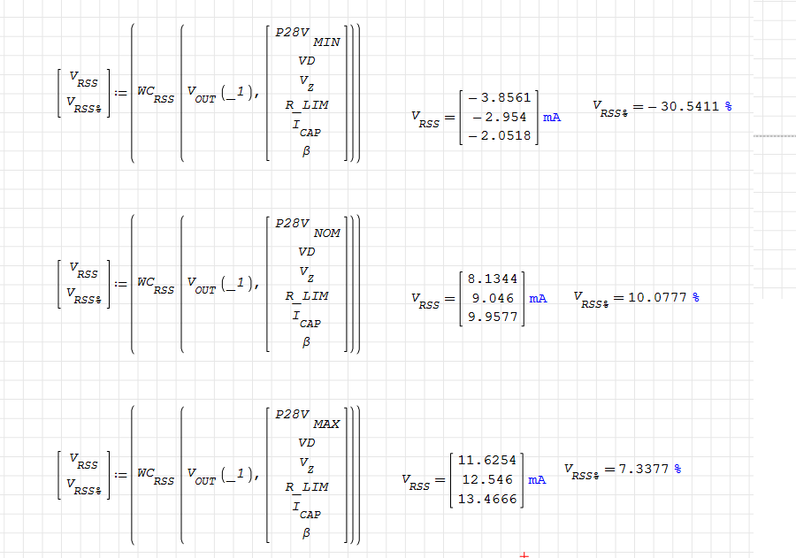 Another potential, and perhaps more meaningful alternative, is to fix the input voltage and perform the RSS analysis at each operating point of concern. Note that the minimum value calculated for P28V.MIN is still beyond the worst case value. So you also have to take that with a grain of salt.