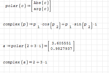 WroteRequest for new feature. Would like to see an angle operator to facilitate polar form of complex number entry similar to that Mathcad Prime provides. Would also like to see the addition of a polar form of math results display also similar to Mathcad Prime. While Mathcad Prime has a lot to complain about besides cost, polar input/output is a great feature that that I believe would also greatly benefit SMath Studio.