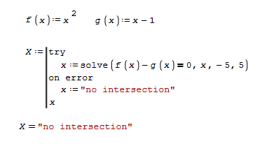 this means that in that interval where the segment is defined the function obtained equating the Enthalpy of a mixture Air-water curve to the equation of the line whose segment belong to doesn't have any zeroes .....but applying the solve function I have the error "no real solution" and I would like to know if programmaticaly I can intercept this error and display a message like the following "the segment doesn't intercept the curve" and this means that the input data for the problem I am dealing with are correct .