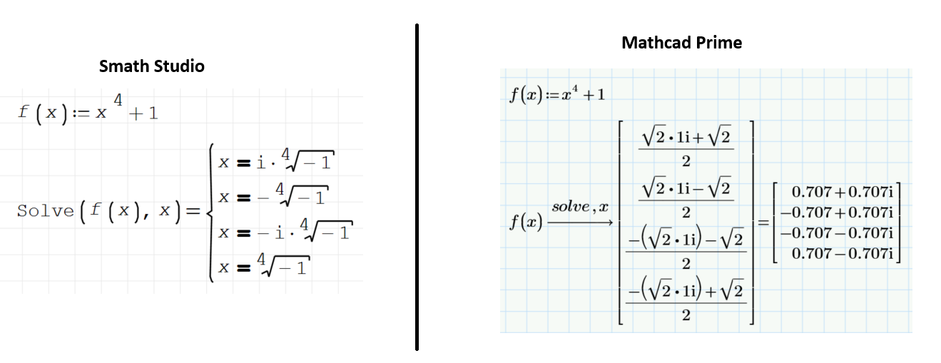 Some comments. The solutions for mathcad's solve and SMath's FindRoots are numerical, so they depend on the initial values, and are susceptible to returning wrong values, without this being considered a bug in the function itself. Therefore, Davide's recommendation to verify the solutions is very accurate. In addition, they can find numerous solutions to a second or fourth degree polynomial equation, even if there is a theorem that says they are exactly two and four respectively.