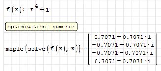 uni, what I do dont yet understand îs why Maxima engine (by using Solve(f(x), x)) gives that "strânge" 4 results (different by maple and mathcad prime results)?