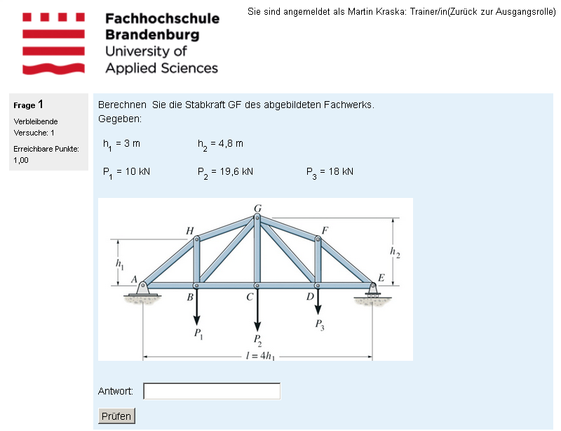 These formula can be several hundred characters long, just imagine to compute the maximum stress in a compound cross section, where the centroid and moments of inertia need to be calculated from the given data. Kay had the job to create and input these reference formulae - guess what he did: writing a plugin for export of expressions to moodle format.