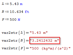 It seems like there is no way to do this without manually specifying the unit because there is no way to convert the variable exactly as defined into a string, you need to divide out the unit to keep the same numerical value. So there is no way to take the b:=17.3 lb and convert that definition into a string exactly as I show it. It would be nice if this was automatic, but I don't this is possible with how SMath is programed.