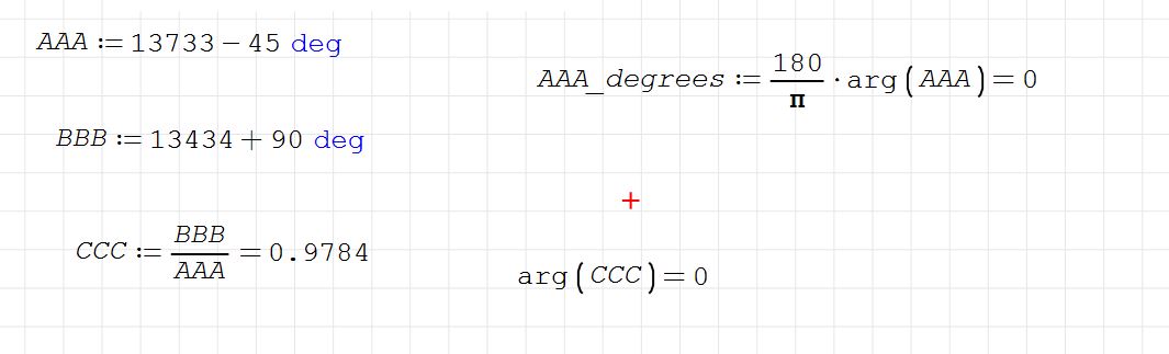I love the idea of the nice and elegant solution to presenting these maths equations, and ability to work with complex numbers. In electricity, it is always in polar form. I seem to be able to add, subtract, multiply and divide complex numbers after entering them in polar notation, i.e. magnitude with degrees. However, I cannot display the angle of a complex number. I'd like to be able to write Answer = Mag < Angle(deg). But I can only get Answer = Mag. Is this possible to do, without having to use other trigonometry inbetween? In which case, I may as well stick with Excel.
