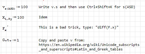 "A dot, bar, hat, or tilde can be positioned over the variable name by adding _dot, _bar, _hat, or _tilde to the name. ... X_ddot will display with a double-dot centered above the X. X_infinity will display as X subscripted with the infinity symbol. X_prime will display as X 'and X_dprime will display as X''"