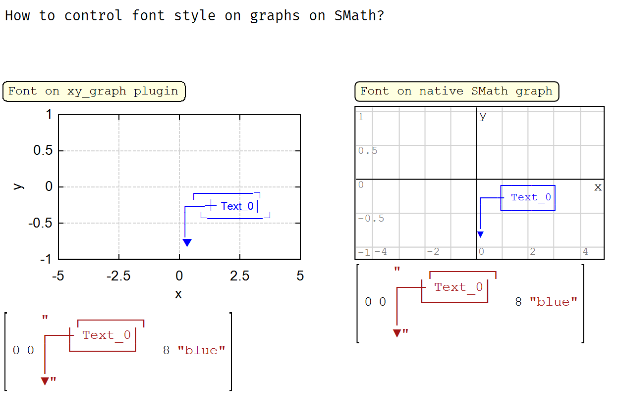 The point is that the text (monospaced) in the native SMath graphics is displayed correctly, but not in the graph plotted by the x-y graph plugin. There is no way to control which font is used for the text in the x-y plugin through the settings. It would be really amazing if you could choose which font you would like to use.