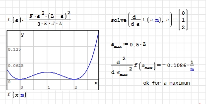 it's a rather simple thing but somehow I'm stuck. Consider a simply supported beam with concentrated force. Let's say that we don't know that deflection will be maximum with force acting in the middle of the beam. How can I find the maximum deflection in SMath ? Of course I have all the data and the formula for deflection of this beam: