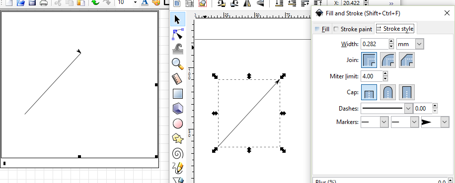 1. Rendering of inkscape arrows. Even though I am using new SVG renderer, the arrow is still off - now it is reversed. On a plus side - arrow on the left end of line points correctly - use that one.