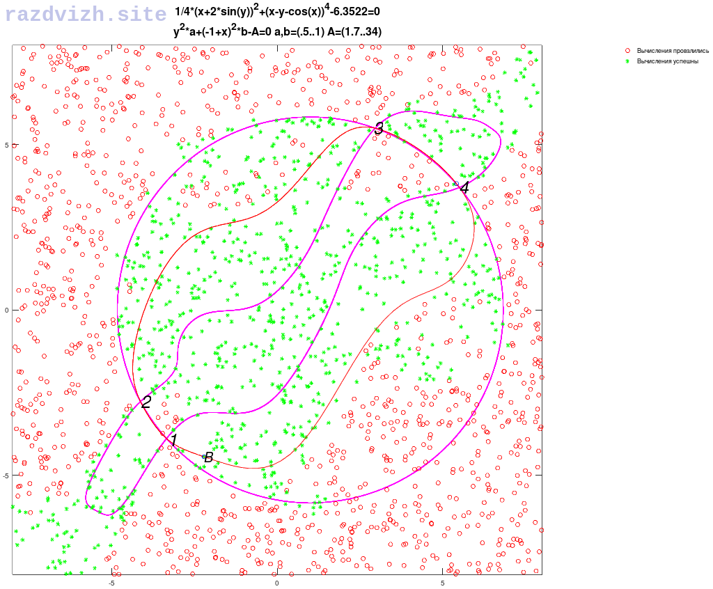 На рис. pol3 представлены три кривые и точки. Третья кривая построена через зеленую точку B. Видно что она пересекает две начальные кривые в точках пересечения 1,2,3,4
