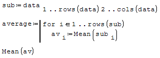 SMath Forum SMath Studio Questions Average 1 Pages (5 items) Average - Messages Go to last post #1 Posted: 2021/6/17 17:18:05 mnorena 0 likes in 13 posts. Group: User hi...I need find the average of each row (without include the first number) and at the end find the average of all averages....thanks for the help #2 Posted: 2021/6/17 17:41:50 Jean Giraud 983 likes in 6,866 posts. Group: User Had you attached the table ... job done.Cheers ... Jean #3 Posted: 2021/6/17 17:47:26 overlord 580 likes in 1,349 posts. Group: Moderator Wrotehi...I need find the average of each row (without include the first number) and at the end find the average of all averages....thanks for the helpLong versionShort version #4 Posted: 2021/6/18 08:02:29 Jean Giraud 983 likes in 6,866 posts. Group: User WroteHad you attached the table ... job done.Average.sm (9.28 KiB) downloaded 643 time(s). #5 Posted: 2021/6/18 08:07:34 Martin Kraska 1,308 likes in 2,221 posts. Group: Moderator Another version with scalar product.Easy to adjust to arbitrary subsets of columns.avg.sm (6.53 KiB) downloaded 650 time(s). Martin KraskaPre-configured portable distribution of SMath Studio: https://en.smath.info/wiki/SMath%20with%20Plugins.ashx 1 users liked this postSerg 2021/6/18 08:33:00 1 Pages (5 items) New Posts No New Posts