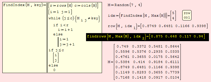 Hello, I'm searching for some function like match(z, A)(Looks in a vector or matrix, A, for a given value, z, and returns the index (indices) of its positions in A) in Mathcad.