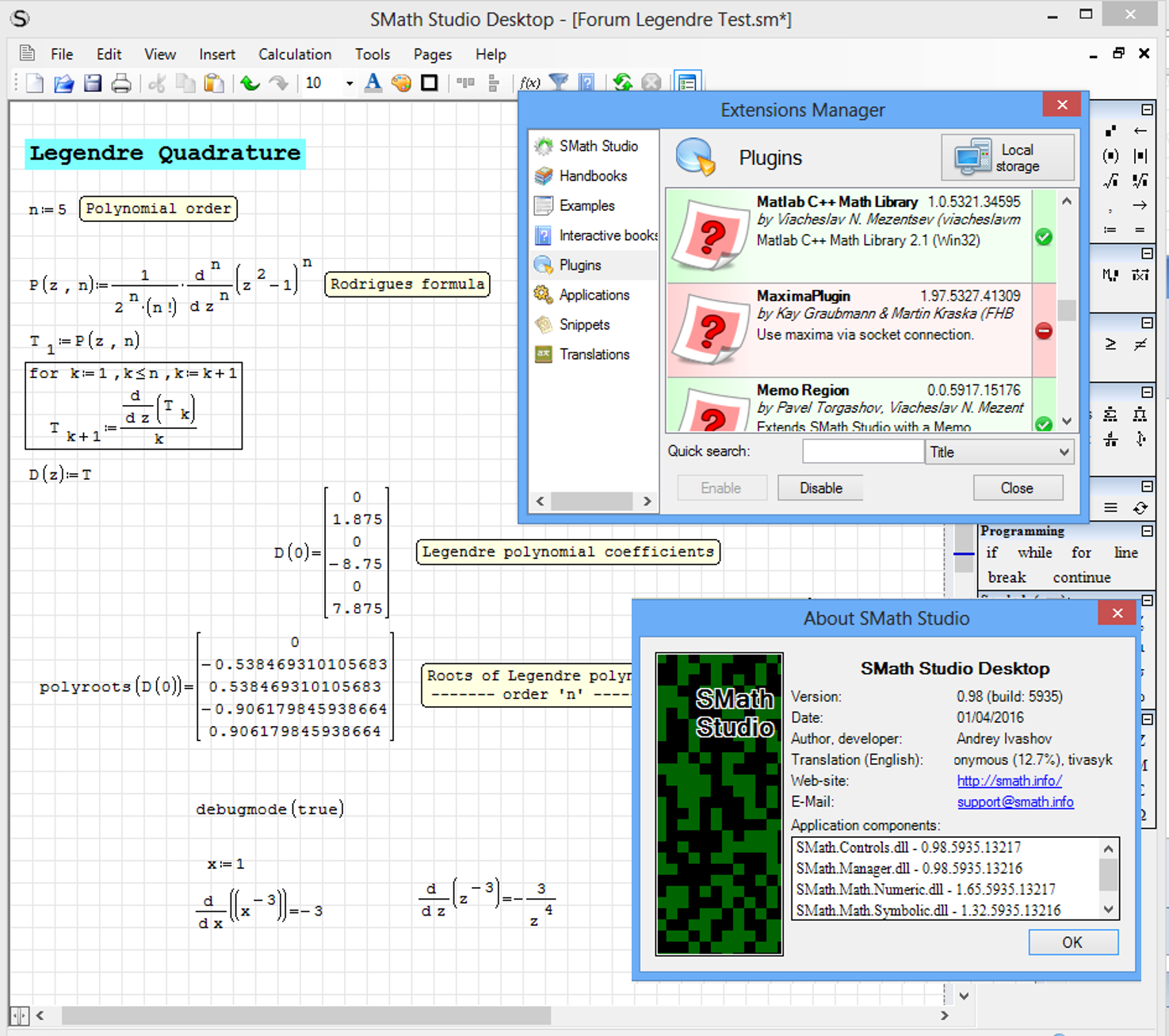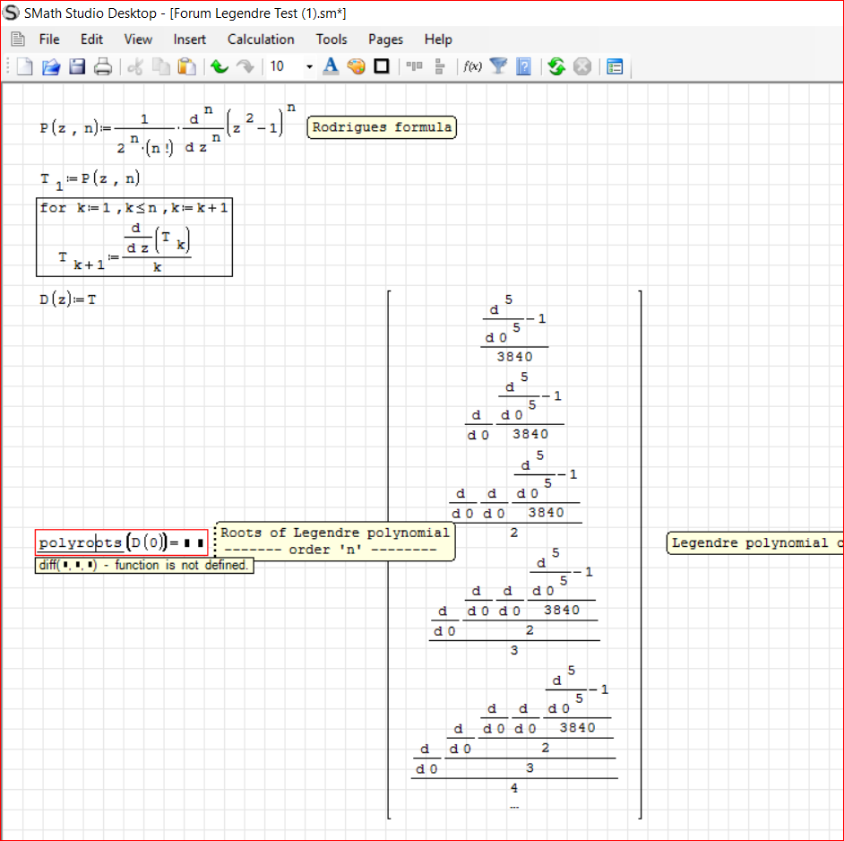 WroteYour "Forum Legendre Test.sm", file does not work correctly in the current version of SMath Studio that I have installed.