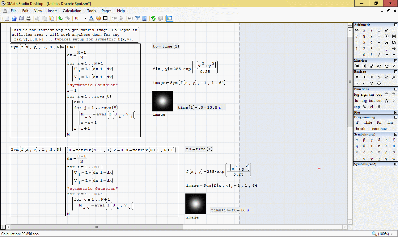 SMath calculation time is very volatile, and it's hard to measure time reliably, even doing multiple comparisons/calculations. E.g., processor temperature, that raises towards second calculation, may cause it to slow down to prevent overheating (contemporary systems do that). Some memory leaks in SMath may cause slow-down of all subsequent calculations (and when the sheet is done calculation, .NET garbage collection may clean it up, so recalculation shows the same picture).