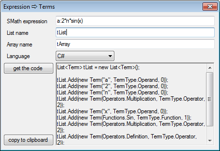Just for curiosity and without any insight into real plugin-coding: Isn't the programmatic representation of the expressions as required in the script region that what the "Expression -> terms" dialog in the Development tools produces?