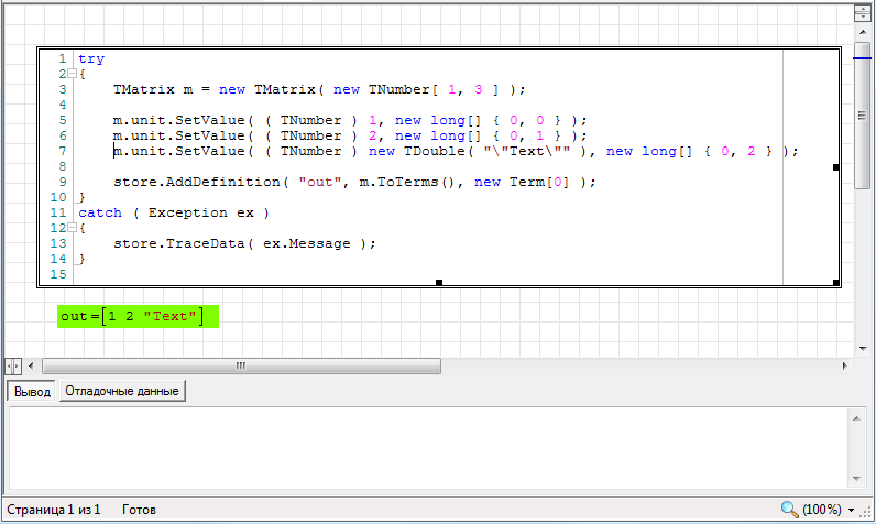 Example 1.try { TMatrix m = new TMatrix( new TNumber[ 1, 3 ] ); m.unit.SetValue( ( TNumber ) 1, new long[] { 0, 0 } ); m.unit.SetValue( ( TNumber ) 2, new long[] { 0, 1 } ); m.unit.SetValue( ( TNumber ) new TDouble( "\"Text\"" ), new long[] { 0, 2 } ); store.AddDefinition( "out", m.ToTerms(), new Term[0] ); } catch ( Exception ex ) { store.TraceData( ex.Message ); }