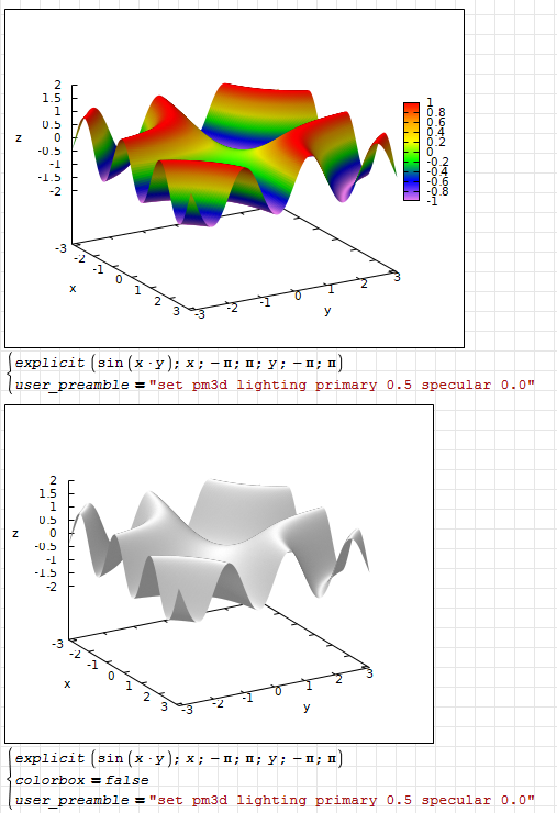 Here is an example of what can be done with Maxima 5.47, just as a teaser. Note that the plots use the Maxima Draw region (Insert> Maxima> Draw3D) with some of the settings made via the settings dialog, e.g. the color palette and the sampling density.