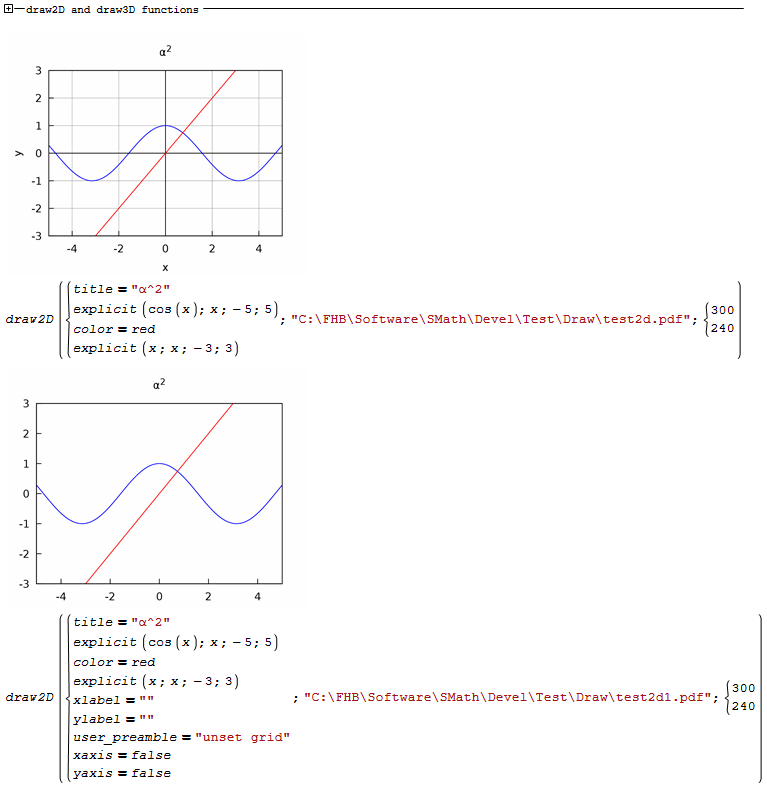 These are prototype Draw2D and Draw3D functions, using direct Maxima commands. After some testing, the functions in the plugin get updated based on these prototypes.