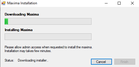 The installer form will appear and immediately initiate the download of the latest Maxima installer from the internet. Once the download is completed successfully, a prompt screen will appear requesting admin privileges. Please grant admin privileges by clicking "Yes" on the prompt. The installer will then run silently. After a few minutes, the status bar at the bottom left of the installer will indicate that the installation was successful, and the "Finish" button will be enabled. Please click on the "Finish" button to complete the installation process.