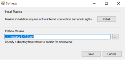 WroteAutomatic search for Maxima in the C:\\ drive. If you have none installed, it will prompt for installation. Installation dialog with download bar and statuses Automatic download of the latest version of Maxima and silent installation with the user's permission. A new settings dialog with an install option.