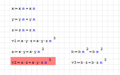 Further, consider the example below, multiple evaluations of a and b do not result in m², m³ etc, however, a second evaluation of c does but further repeated evaluations do not.
