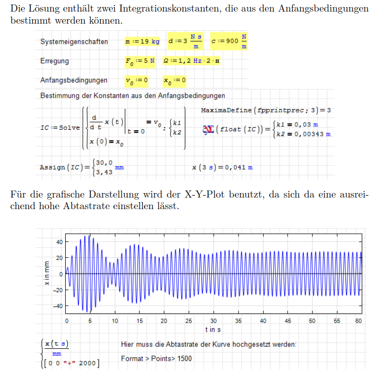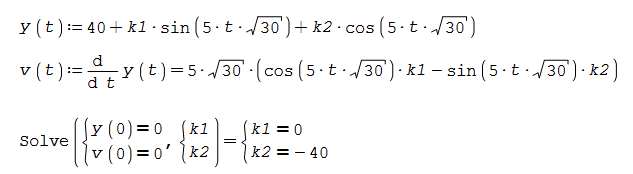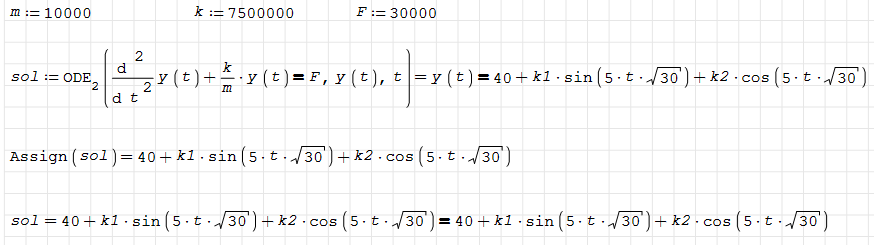 SMath Forum SMath Studio Questions How to apply initial conditions in second-order differential equations 1 Pages (3 items) How to apply initial conditions in second-order differential equations - How to apply initial conditions in second-order differential equations - Messages Go to last post #1 Posted: 2025/12/7 03:59:55 kimkim 0 likes in 9 posts. Group: User How to apply initial conditions in second-order differential equationsThe solution to the second-order differential equation has been obtained as follows.If we want to find the solution by applying the initial conditions y(t)=0, y'(t)=0,what should I do in the following steps?thank you for your help. Edited 2025/12/7 06:53:24 #2 Posted: 2025/12/7 09:07:00 StvMath 43 likes and 1 dislikes in 68 posts. Group: User Once you've got y(t) you could simply do the following: 1 users liked this postkimkim 2025/12/7 21:41:13 #3 Posted: 2025/12/7 12:54:45 Martin Kraska 1,308 likes in 2,221 posts. Group: Moderator If you don't need the function v(t), you can specify the initial conditions directly: (example 10.2 in https://github.com/sn-code-inside/Technische-Mechanik-mit-SMath) Martin KraskaPre-configured portable distribution of SMath Studio: https://en.smath.info/wiki/SMath%20with%20Plugins.ashx 3 users liked this postsergio 2025/12/7 17:07:45, kimkim 2025/12/7 21:41:18, ioan92 2025/12/9 10:52:27 1 Pages (3 items) New Posts No New Posts