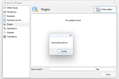 SMath Forum SMath Studio Bugs & Problems Error accessing the online gallery 1 Pages (1 items) Error accessing the online gallery - I can't access the Plugins Online Gallery - Messages Go to last post #1 Posted: 2023/10/10 16:23:04 CBG 78 likes in 312 posts. Group: User I can't access the Plugins Online GalleryBest RegardsCarlos 1 Pages (1 items) New Posts No New Posts