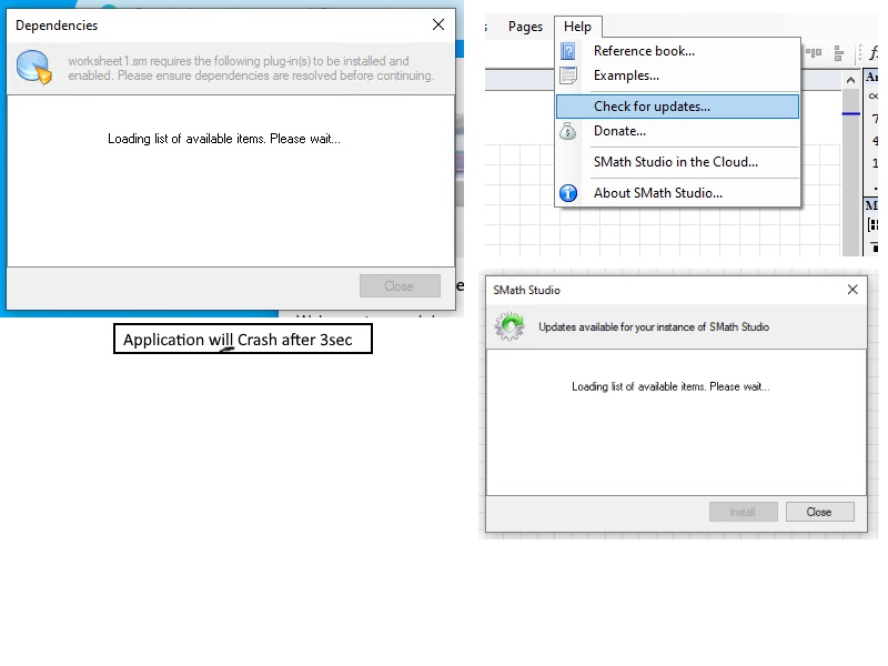WroteBut, even if no file is open, SMath crashes if I call "Search for updates" or if I open the plugins dialogue and select "Online gallery".