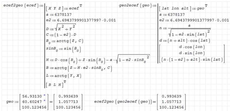 SMath Forum SMath Studio Samples Converting between ECEF and Geodetic Coordinates 1 Pages (1 items) Converting between ECEF and Geodetic Coordinates - How to convert from Geodetic coordinates (lat,lon,alt) to ECEF coordinates - Messages Go to last post #1 Posted: 2021/5/14 08:01:35 Вячеслав Мезенцев 1,532 likes in 1,838 posts. Group: Moderator For heights from 0 to 15 km.ecef2geo (Ogorodova).sm (9.92 KiB) downloaded 837 time(s).1. Ogorodova, A simple method of transforming geodetic rectangular coordinates to geodetic curvilinear coordinates is recommended. (pdf, rus).ecef2geo (Ogorodova).pdf (335.78 KiB) downloaded 451 time(s).2. Converting between Earth-Centered, Earth Fixed and Geodetic Coordinates Russia ☭ forever, Viacheslav N. Mezentsev 1 Pages (1 items) New Posts No New Posts