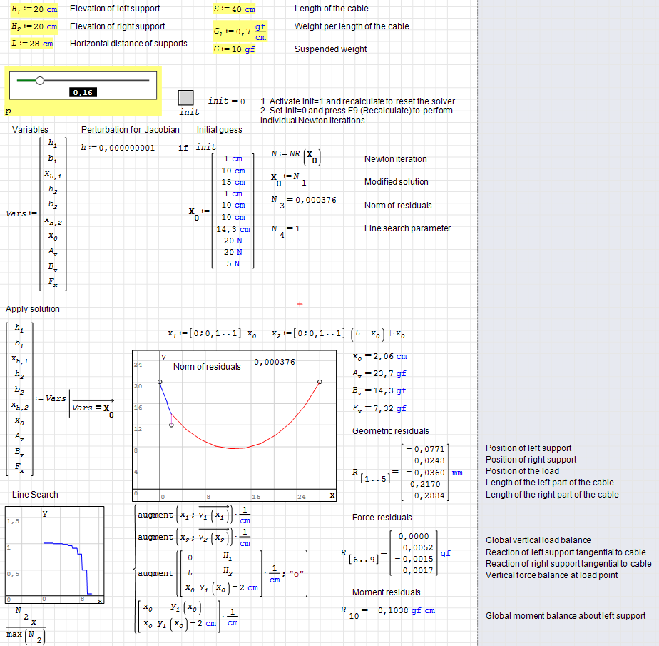 We take an inextensible cable of length L and with a known specific gravity (the mass of one meter of cable). We attach a load of known mass to this cable at a distance l from one end of the cable. Next, the cable with the load is attached at two points. It is necessary to determine the geometry of the cable sag and the force at the attachment points. Then you need to change the value of l from zero to L and create an animation.