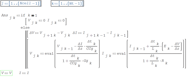 I am not sure this answers your question. In my scheme, j=1..Ncell is in the voltage loop where the end conditions are applied. j=1..Ncell-1 only applies to the current loop, but the end conditions are not applied in the current loop, only in the voltage loop. In my scheme, the space loops on j are inside the time loop on k. In your scheme, it is not clear to me that the space loops are inside the time loop, but I am not yet familiar enough with SMath’s structure to be sure of that.