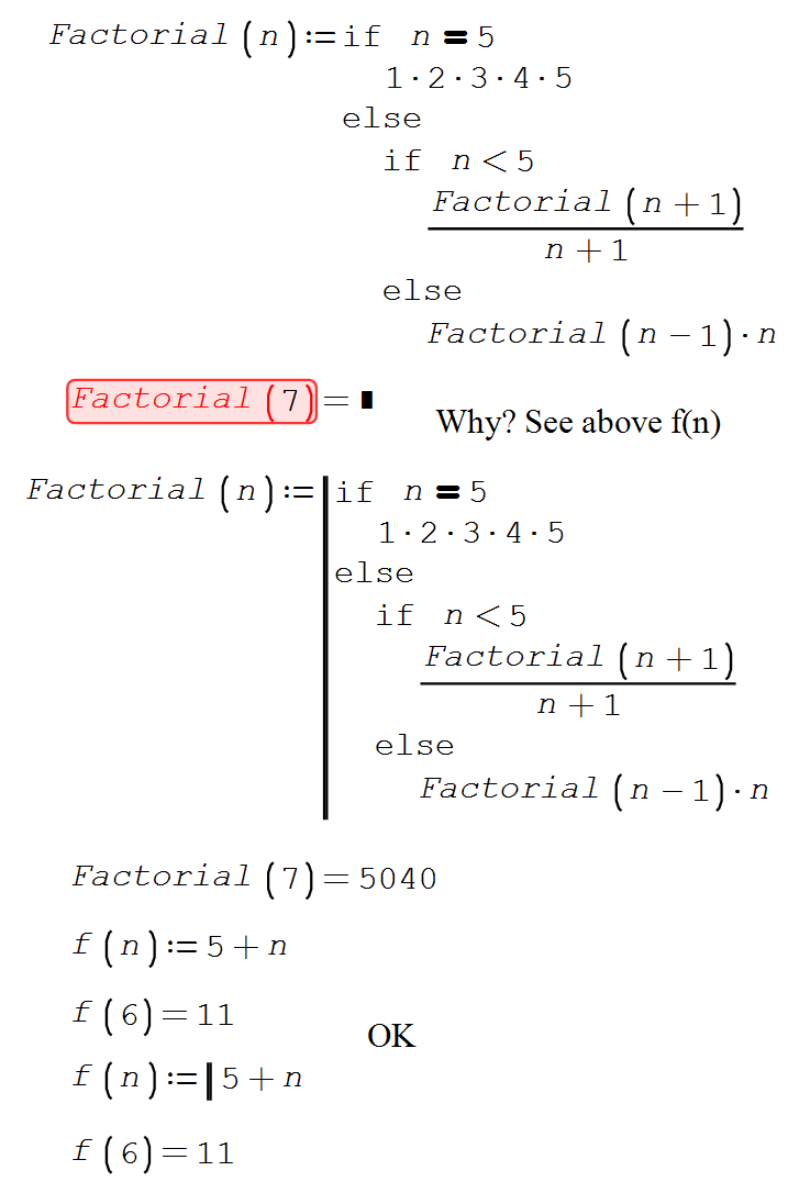 The key is that you are using a recursive pattern, and in the first case the internal Factorial() can't be calculated because the context in which the function runs is the "top level" (the canvas), where Factorial(1) doesn't yet exists (it will exists for the next region on the closest canvas pixel on the right side).