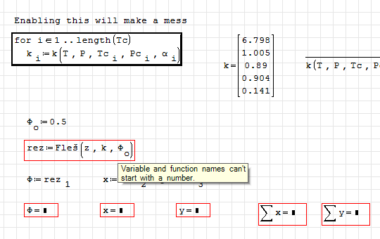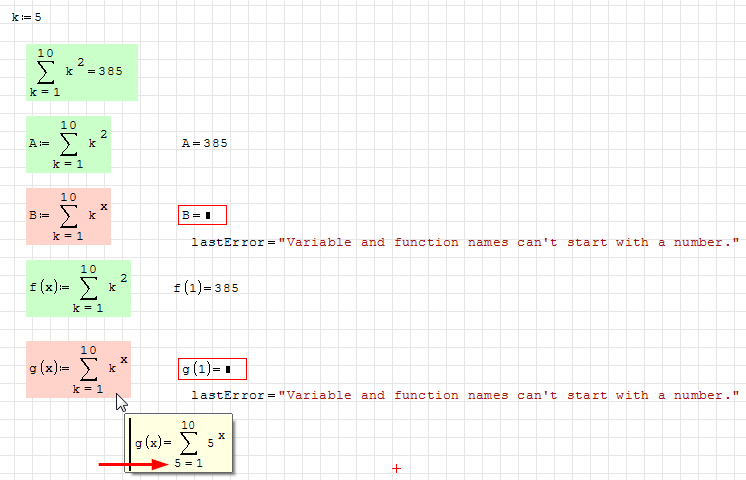 Thank you Jean for your analysis, but I think that here is again introduced some glitch regarding variable i and for loops. I can not figure out what actually happen here, but I could see that there is something that causes that strange error message. Somehow, in the summation instead of variable "i", you get the actual value of i (I do not know why) and it complains because variable can not start with number.