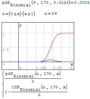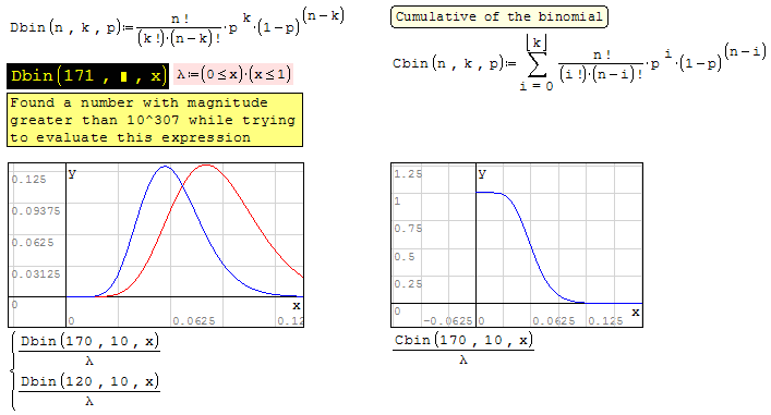 This limits the value of the number of trial to less than 170 or an overflow occurs (which SMath catches). A better way may be to use the multiplicative formula to calculate the binomial coefficent term of the PDF which won't overflow until 980 and only then when x = n/2. As x tends away from n/2, the number of trials entered can be significantly increased without overflow. In this case, you need to add the condition that if x = 0 then the binomial coefficient = 1 due to a div/0.