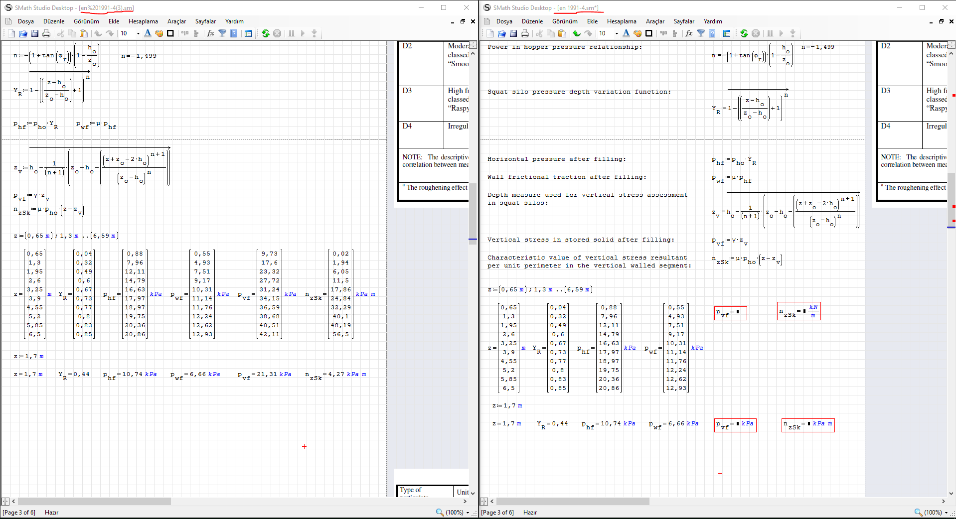 I want to create a file to calculate pressures in a cylindrical silo with respect to EN standards. I have entered the datas and formulas needed to calculate. Bu the programe can't calculate a formula.