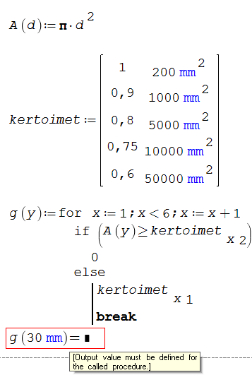 I have not been able to understand the purpose for which the imagined algorithm is used. As the question arises, it is a case of express identification of a certain value in the "kertoimet" matrix. In this case in 99.99 (9 ...) of cases, the result will be an error. If so then you can avoid ambiguity using the first procedure (case identification) in the attached file. Looking at the problem in terms of practical use, in the first column of the "kertoimet" matrix there are some non-dimensional coefficients corresponding to circular x-ray surfaces with the area expressed in square millimeters. In this case, a linear interpolation of these coefficients would be useful depending on the radius of the circle, and the procedure is the one presented in the case of interpolation.