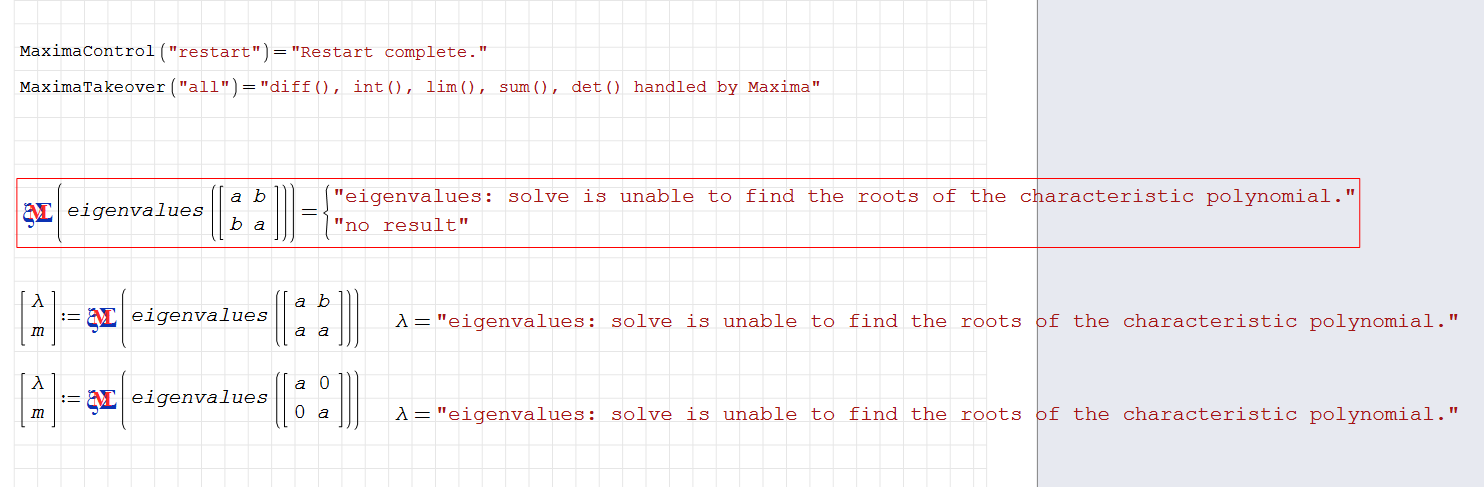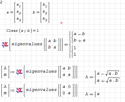 SMath Forum SMath Studio Questions eigenvalues error 1 Pages (2 items) eigenvalues error - Messages Go to last post #1 Posted: 2023/12/11 17:03:30 soomoon 1 likes in 39 posts. Group: User i'm studying SMath with Maxima (written by Dr. Kraska)but i did not get the result.my result is this.smath with maxima.sm (94.66 KiB) downloaded 801 time(s).thank you in advance #2 Posted: 2023/12/11 23:27:17 Martin Kraska 1,308 likes in 2,221 posts. Group: Moderator You have to clear the values of a and b. These must be scalar variables, in your sheet these are vectors. Martin KraskaPre-configured portable distribution of SMath Studio: https://en.smath.info/wiki/SMath%20with%20Plugins.ashx 1 users liked this postsergio 2023/12/12 00:59:00 1 Pages (2 items) New Posts No New Posts