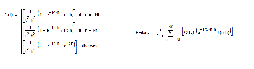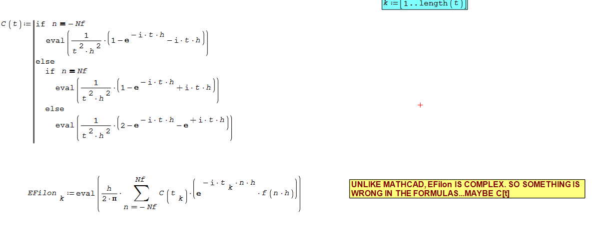 SMath Forum SMath Studio Questions SMATH VS. MATHCAD 15 FORMULAS 1 Pages (3 items) SMATH VS. MATHCAD 15 FORMULAS - Formula Question - Messages Go to last post #1 Posted: 2024/5/4 18:35:03 RegRetired 8 likes in 143 posts. Group: User Can someone familiar with both SMATH and MATHCAD 15 tell me if these formulas are equivalent because I get very different results for each software. MATHCAD produces correct results and SMATH does not.MATHCAD 15 Formulas:SMATH Formulas:Thanks for any help. Reg CurryLoveland, CO #2 Posted: 2024/5/4 19:09:11 Oscar Campo 135 likes in 309 posts. Group: Moderator Hi,Use function cases() to define C(t)C(t):cases(#,#,#,#,#) #3 Posted: 2024/5/5 01:55:08 RegRetired 8 likes in 143 posts. Group: User 👍Thanks much. I’ll give that a try.Reg Reg CurryLoveland, CO 1 Pages (3 items) New Posts No New Posts