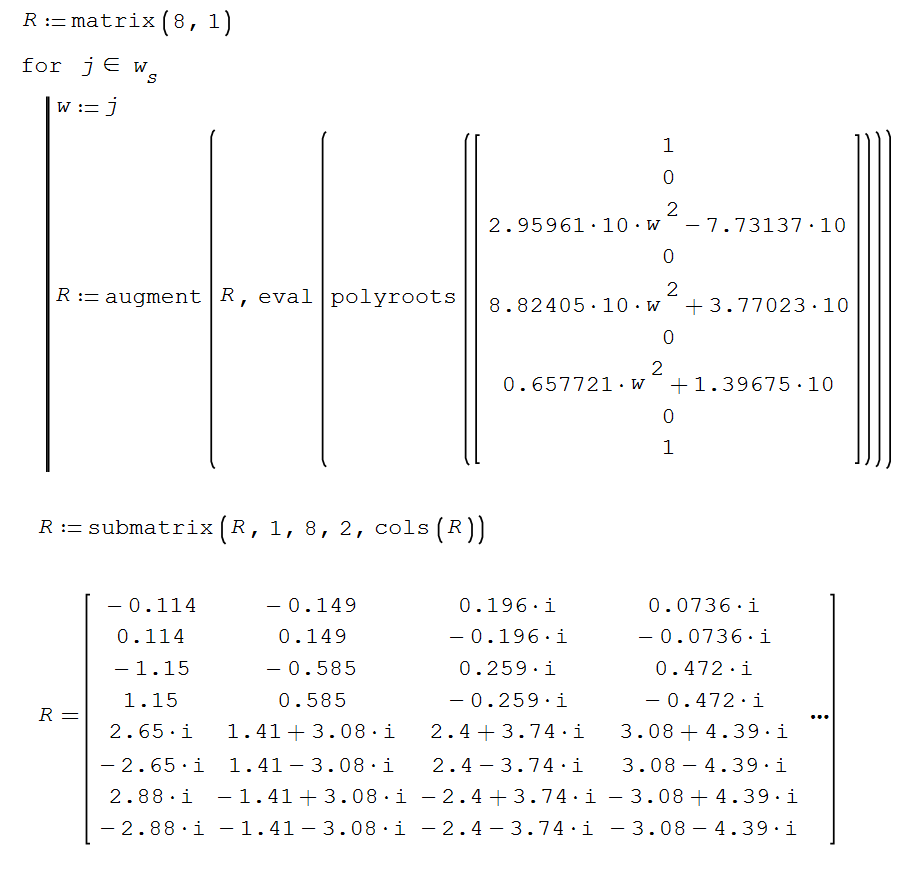 Hello Smath community, I have a problem that I can't fix. In this worksheet I want to create a matrix "R" that contains the roots of a polynomial for different values of the parameter "w". I created a for loop that should be able to do this but I dont know how to index inside the for loop for different columns of "R" (Each column should be the roots for each value of the parameter).eigen.sm (10.76 KiB) downloaded 848 time(s).