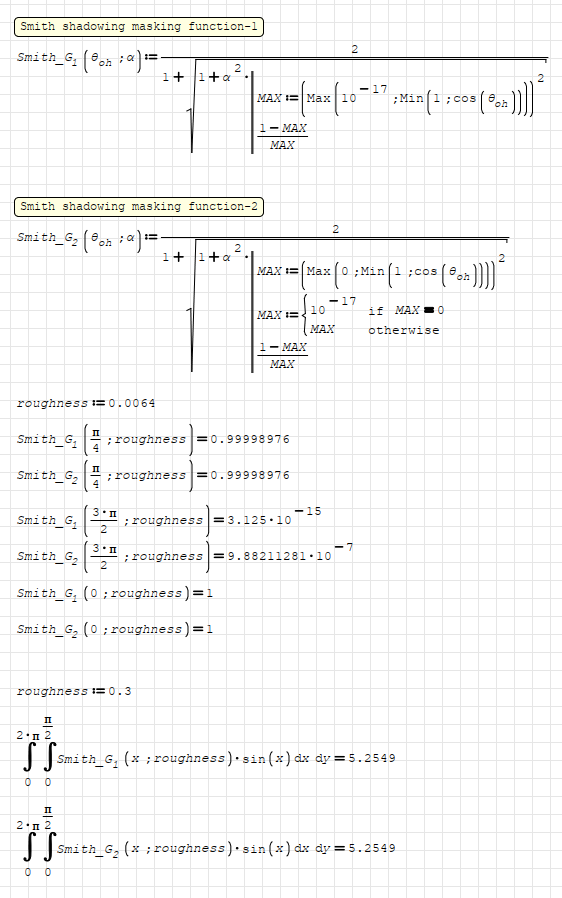 There you don't show the roughness value. Notice that the min(1,cos(theta)) it's cos(theta). Also, there the integration about y it's just 2*pi*int around x.