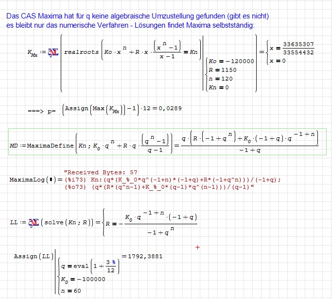 Im Video zum Schluß lass ich Maxima meine Anuitätenformel auf die verschiedenen Variablen umstellen und auf dem Arbeitsblatt (siehe Bild) hab ich MaximaDefine so eingesetzt wie ichs verstanden hab.