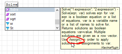 1. No need to wrap Maxima() around Solve(). Solve() is known to SMath Studio via the plugin, just as Assign.