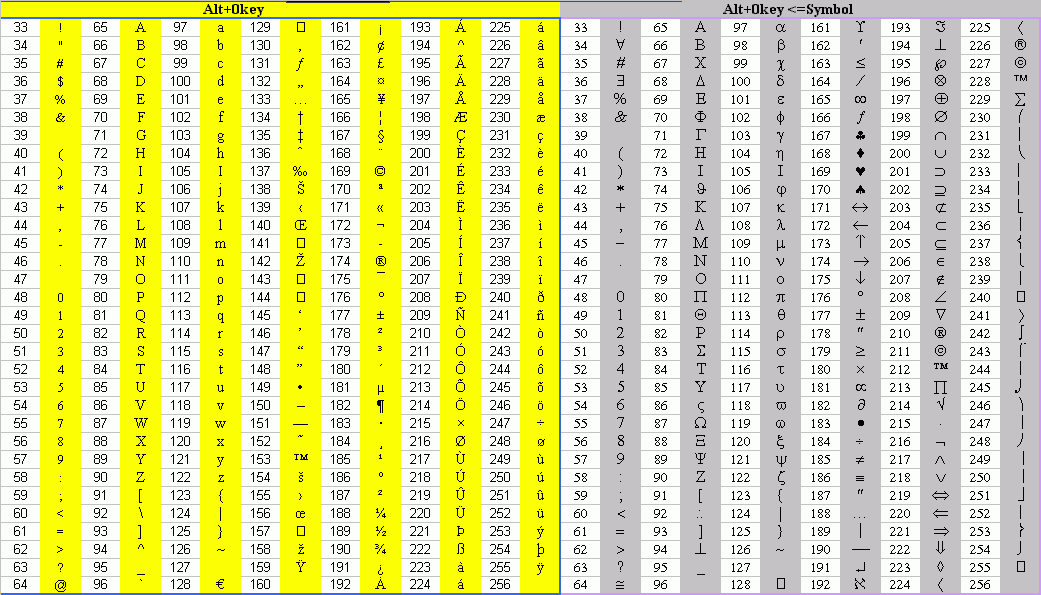 I found some symbols from [Alt+key, Alt+0key] very useful. Maybe ask Andrey if it's