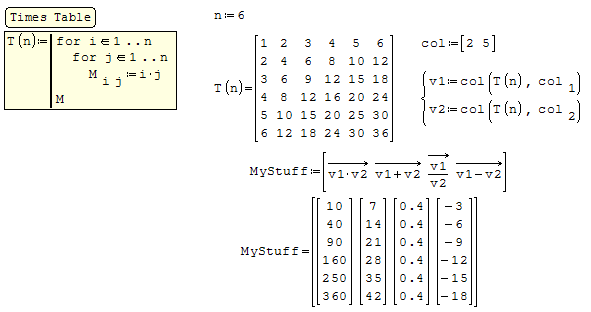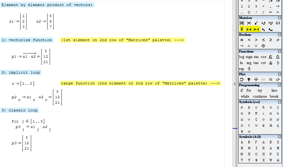 SMath Forum SMath Studio Questions multiply vector or matrix 1 Pages (4 items) multiply vector or matrix - matrix and vector - Messages Go to last post #1 Posted: 9/20/2019 10:54:13 AM icywolfbrain 0 likes in 1 posts. Group: User Hey.Last several day iam thinking how to multiply vector in smath likeExample x1=(1,2,3)*x2(2,3,4)=(2,6,12)matrix1=( 1 ) * (2)= (2) ( 3 ) (3) (9) ( 5 ) (4) (20)Please someone answer on question. #2 Posted: 9/20/2019 12:17:58 PM Davide Carpi 1,435 likes in 2,913 posts. Group: Moderator Here you have several wayselement by element product.sm (6.83 KiB) downloaded 625 time(s).P.S. please open any thread in the appropriate section of the forum. If you like my plugins please consider to support the program buying a license; for personal contributions to me: paypal.me/dcprojects #3 Posted: 9/20/2019 1:12:15 PM Jean Giraud 983 likes in 6,866 posts. Group: User WroteLast several days I am thinking how to multiply vector in smath #4 Posted: 9/20/2019 1:18:30 PM Jean Giraud 983 likes in 6,866 posts. Group: User Utilities Matrix TimesTable.sm (9.81 KiB) downloaded 688 time(s). 1 Pages (4 items) New Posts No New Posts
