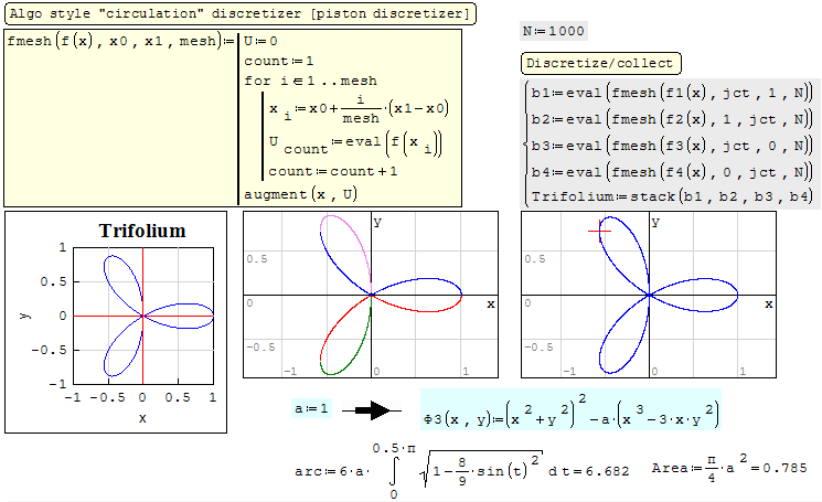 SMath Forum SMath Studio Samples Trifolium 1 Pages (2 items) Trifolium - Trifolium - Messages Go to last post #1 Posted: 11/5/2018 7:49:53 PM Jean Giraud 983 likes in 6,866 posts. Group: User By how much fmesh(f(x),x0,x1,mesh) has simplified ordinary discretizeris striking of realism ! No sweat => done.2D Parametric Plot [Create Trifolium] Copy.sm (24.34 KiB) downloaded 593 time(s). #2 Posted: 11/6/2018 2:01:23 AM Jean Giraud 983 likes in 6,866 posts. Group: User 2D Parametric Plot [Create Trifolium] Copy.sm (30.84 KiB) downloaded 579 time(s). 1 Pages (2 items) New Posts No New Posts