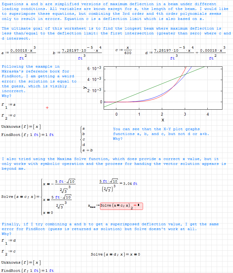 The plot problem is due to unit mismatch. Note that in plots, the independet variable always gets unit-free values (except in Maxima Draw plots, if you specify limits with units). Thus you have to make sure that the functions to graph get arguments with the correct dimension. If you define the function explicitly, then something like a(x m) will work. If it is just an expression, then use the substitution operator at() from the Custom Functions plugin.