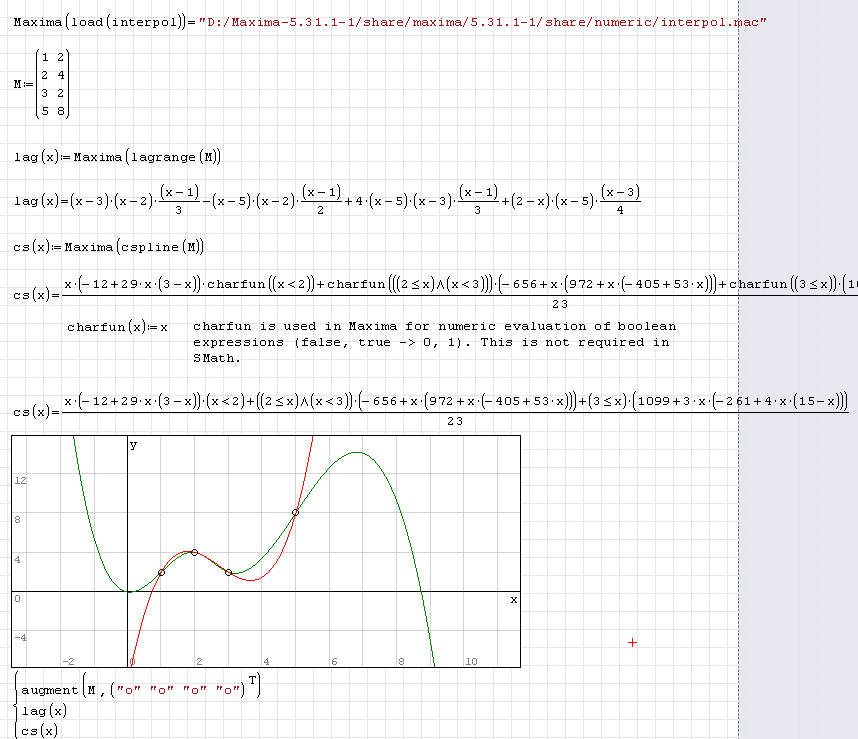 Here is the problem I bumped into. I was just playing with Maxima package interpol and find out that it crashes SMath for cspline() and linearinterpol() functions when the Optimization is turned to None. I suppose that the charfun2() causes this problem, but do not know why. Please look at the example and try to turn the optimization to None for the red area. If the Symbolic optimization is on, then the error is issued. If I turned Optimization to None, then SMath crashes on my computer.