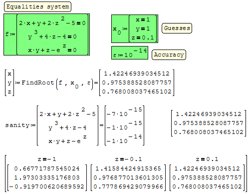 In this examples , FindRoot(,,,) = Mathcad.
