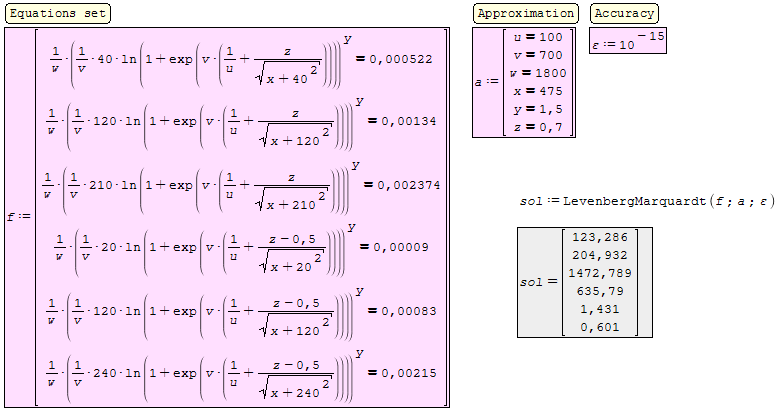 I think it would not be bad for Davide to verify my algorithm (it does not correspond in any case to the syntactic precepts used in SMath) to append it and add it to its other models, from where I saw the Levenberg-Marquardt method missing . I will not have claims. What Martin has suggested to me is useless in this case. In the file below I tried to apply LevenbergMarquardt(3) to the simple example of 3 unknown 3 equations that appears in the picture in message # 54. An error occurred.