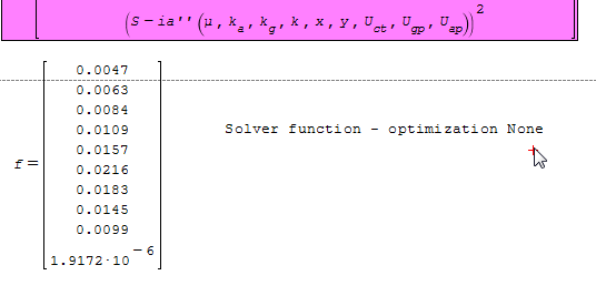 I did some corrections because you had some errors. Your f - "Solver function" was problematic and quite wrong. The vectorization did not work as you expected. Therefore I used for loop to overcome the problems - defined iaa() instead of ia() function (see for yourself, please). However, you will have rather huge number of equations to be minimized in order to find those seven variables. Mathcad will solve those things easely. Nevertheless, I mentioned many times that this kind of minimization problems (least squares for example) when you have rather complicates analytical expression is almost impossible to solve in SMath. Just for example, see the changed f - "Solver function". I made your problem with ten equations which have to be minimized. You can also made just one (by adding them, for example). But all these things will not be on any help. SMath is relaying on its symbolical symbolic engine - not numerical (I mentioned this many times).