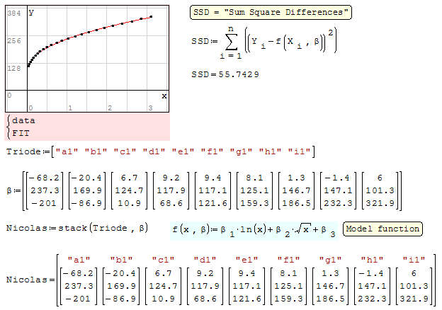Your skill in developing mathematical models is remarkable and I sincerely appreciate it as such. The big problem is that when I use a mathematical regression in a simulator to model a set of features like those I mentioned, I have a simple script to introduce this regression like Ia = 0.001113 * (0.001277 * v ( 2.4) * ln (1 + 2.718282 ^ ((782.9 * v (1.4) +503.05) / (V (2,4) + 2.004 475 783 ^) ^ 0.499 + 7.6159))) ^ 1.4922 where Ia is the function, and v (1,4) and v (2,4) are the variables. If you can tell me how I can enter a matrix array variable (such as β) into such a script then accept the solution. Otherwise, I would like to stick to the analytical function that I put in the pictures in the first post. If you have enough experience to change it in order to increase the precision of the results, this could be beneficial. The relationship I have written in the first post is one that has been developed over time by more passionate electronics professionals and / or amateurs. Based on this, electronic tubes could be loaded onto modern electronic simulators. The problem is to be able to determine sets of specific factors for each device. A similar relationship exists for pentodes, this relationship being for triodes. So let's try to determine the specific factors ka, kg, k, Uct, x, y, μ for that relationship. This is the purpose of this topic.